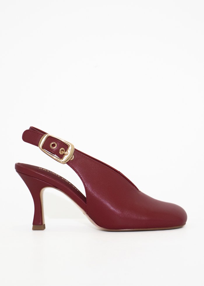 Šviesios spalvos lakuotos odos klasikiniai bateliai su smeilėjančia nosele. Užsegami sidabro spalvos reguliuojama sagtimi.