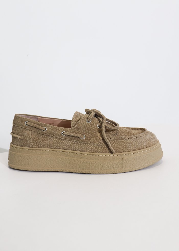 Šviesios spalvos laisvalaikio bateliai. Varstomi raišteliais. Apvali noselė. Storas padas.