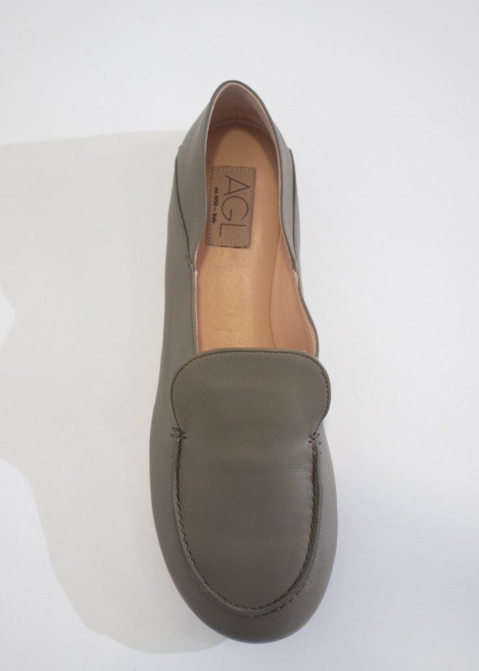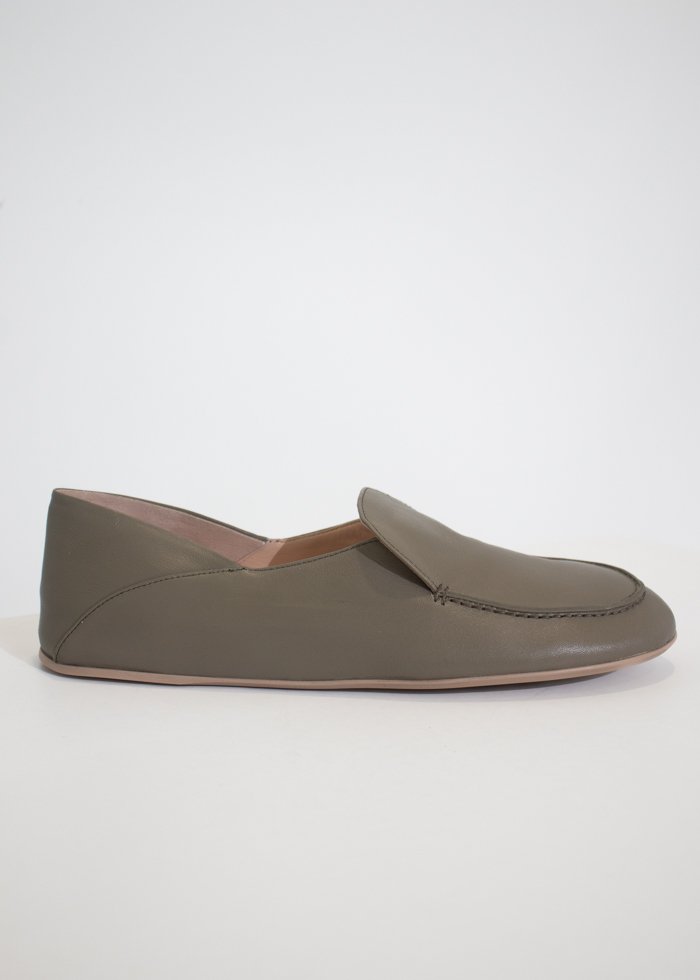 Žalsvos spalvos odiniai lengvi bateliai su apvalia nosele.