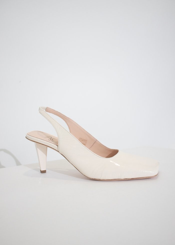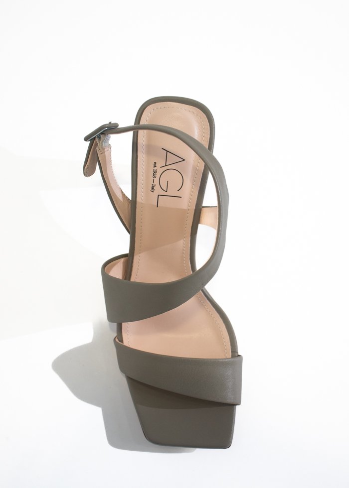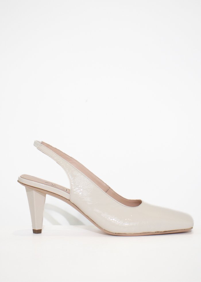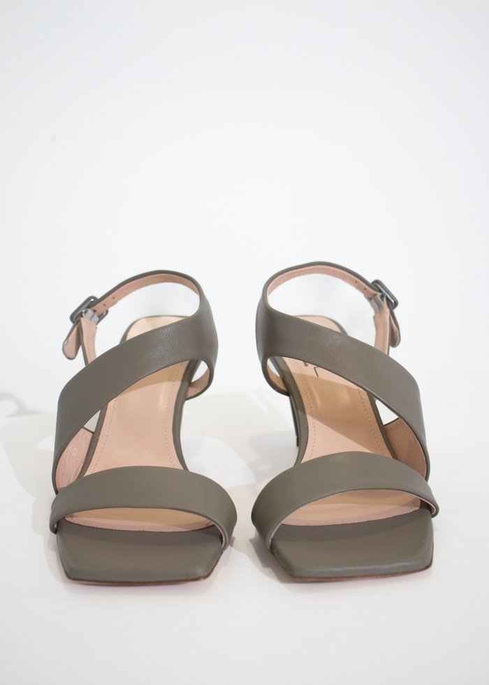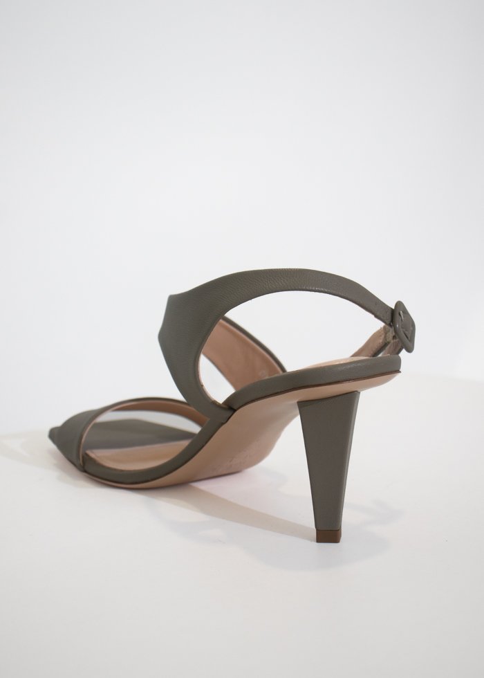 Žalsvos spalvos elegantiškos basutės ant kulno. Kvadratinė atvira noselė. Užsegamos reguliuojamu dirželiu.