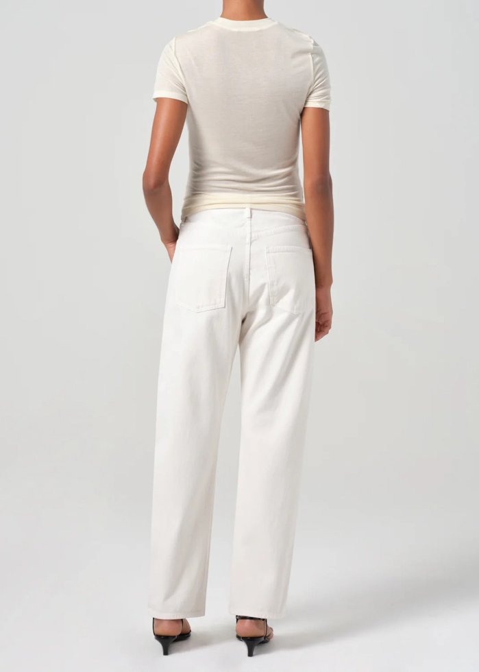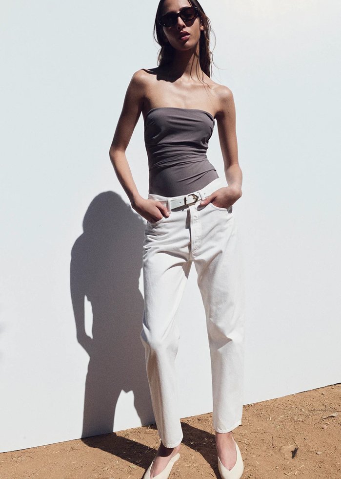90-ųjų įkvėpti džinsai iš švaraus balto džinso, pagaminti iš regeneratyvios medvilnės. Vidutinio liemens, laisvesnio silueto per klubus, su tiesiomis, laisvai krentančiomis klešnėmis. Švarus, lengvai derinamas modelis, puikiai tinkantis kasdieniams, minimalistiniams įvaizdžiams.