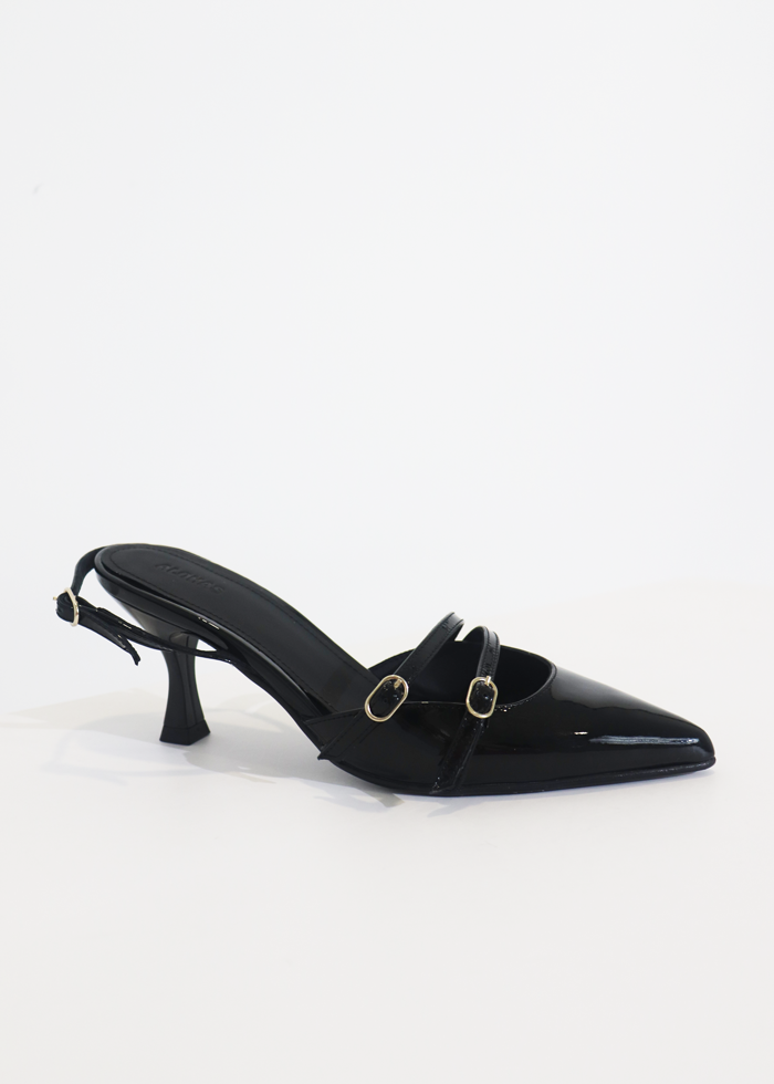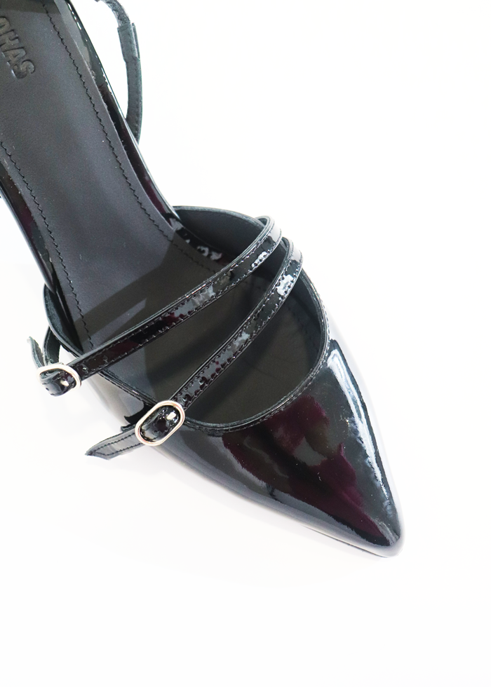 „Joelle“ modelis pasižymi elegantišku siluetu – pagamintas iš blizgios lakuotos odos ir pastatytas ant plono kulniuko. Smailėjanti noselė išryškinta siaurais dirželiais su sagtelėmis per priekinę dalį, suteikiančiais modeliui subtilaus išskirtinumo ir rafinuotumo.