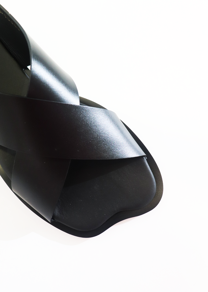 Juodos odos basutės su kryžiuotais dirželiais.