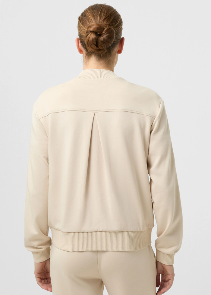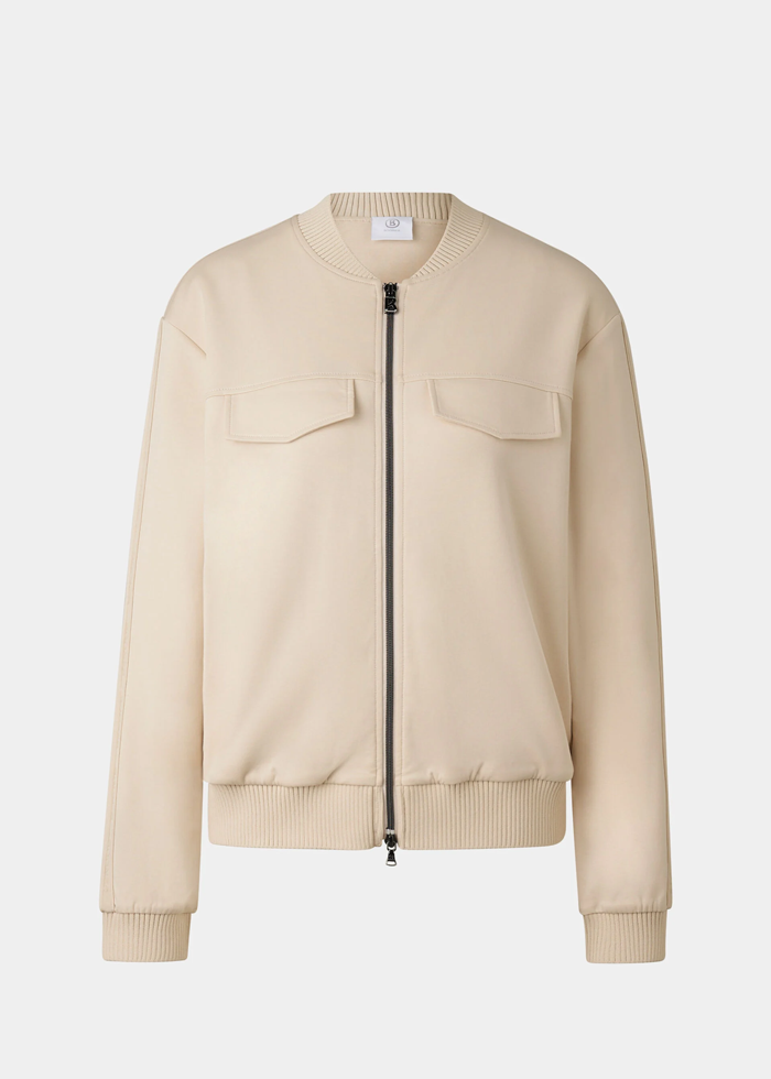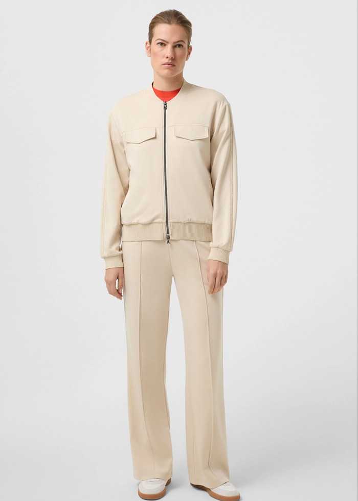 Šviesios spalvos laisvalaikio džemperis ilgomis rankovėmis. Užsegamas dvigubu užtrauktuku. Kišenės.