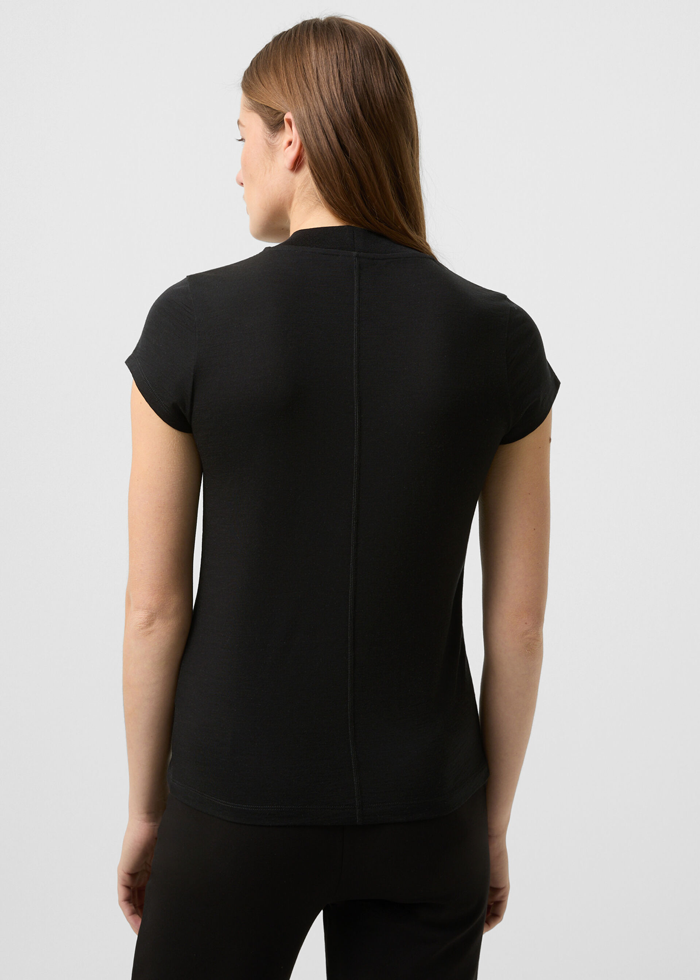 Juodos spalvos plonos vilnelės marškinėliai trumpomis rankovėmis. Aukštesnė apykaklė.