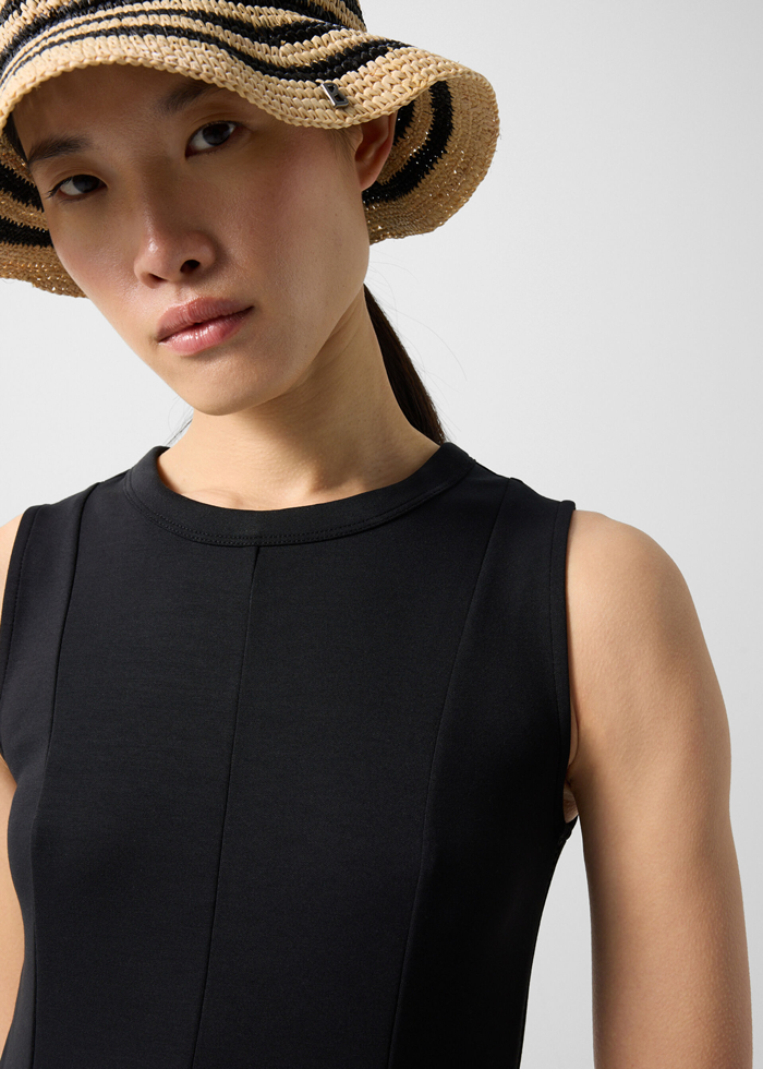 Tamprus modalo mišinio audinys suteikia Rebecca džersio suknelei ypatingo komforto. Modernų dizainą papildo šonuose esantis ažūrinis siuvinėjimas ir figūrą formuojančios siūlės, o logotipo „signé“ detalė suteikia išskirtinį akcentą. Apvali iškirptė užbaigia modelį klasikiniu akcentu.
