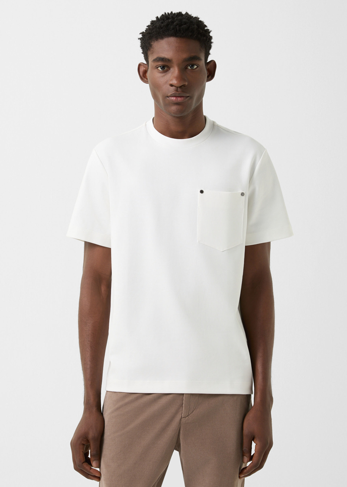 Juodos spalvos standaus audinio marškinėliai trumpomis rankovėmis. Laisvas siluetas. Apvali kaklo iškirptė. Kišenė.