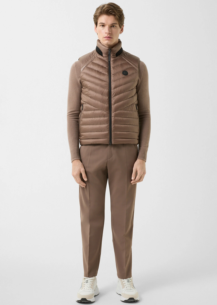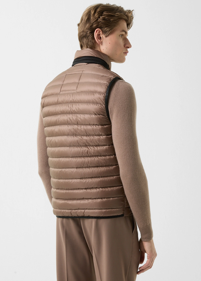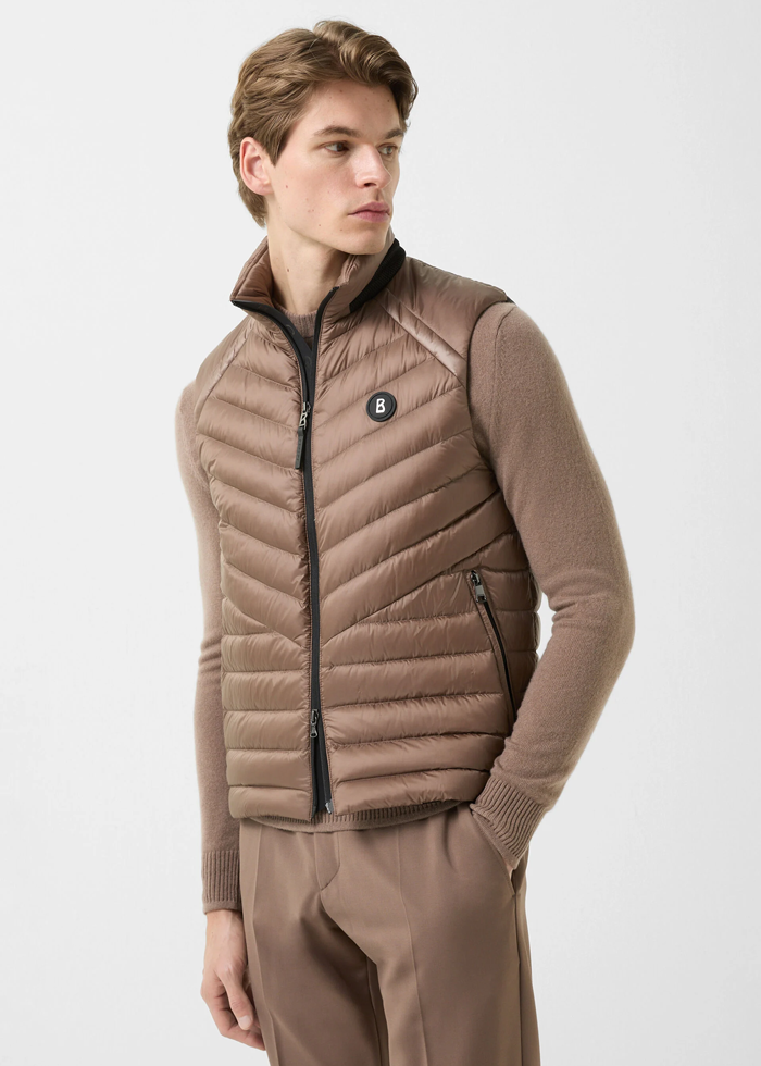 Rusvos spalvos natūralaus užpildo dygsniuota liemenė. Užsegama dvigubu užtrauktuku. Užsegamos kišenės.