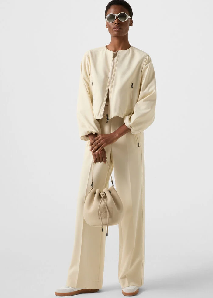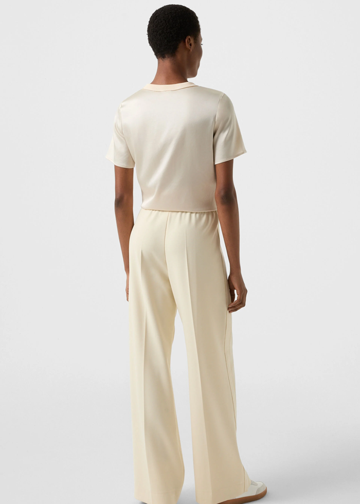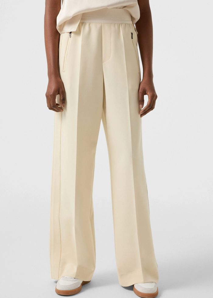 Šviesios spalvos plataus silueto kelnės. Elastinis juosmuo. Užsegamos kišenės.