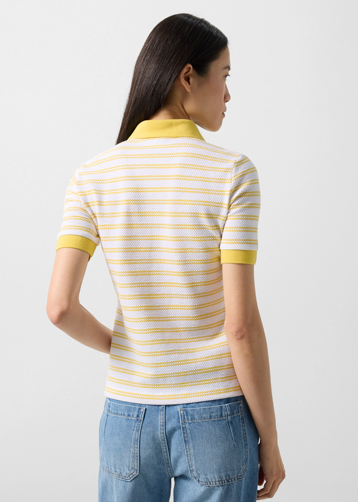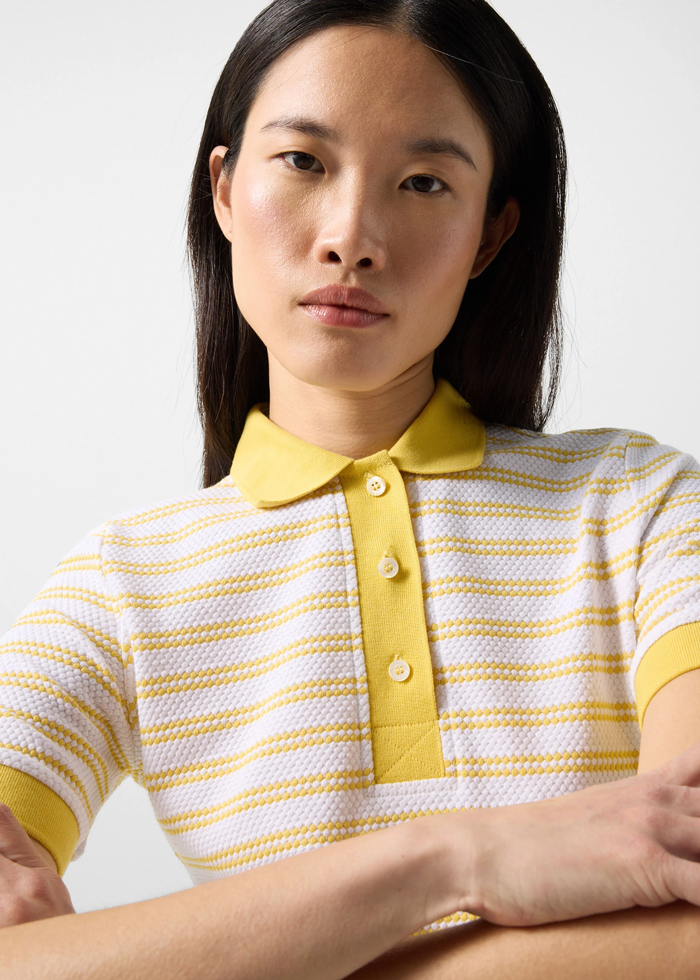 Wendy polo marškinėliai išsiskiria tekstūruotu dryžuotu audiniu, kurį klasikiniu akcentu papildo polo apykaklė su trumpu sagų užsegimu iš perlamutro. Rantuoti rankovių kraštai suteikia papildomo komforto. Subtili logotipo „signé“ detalė užbaigia dizainą būdingu prekės ženklo akcentu.