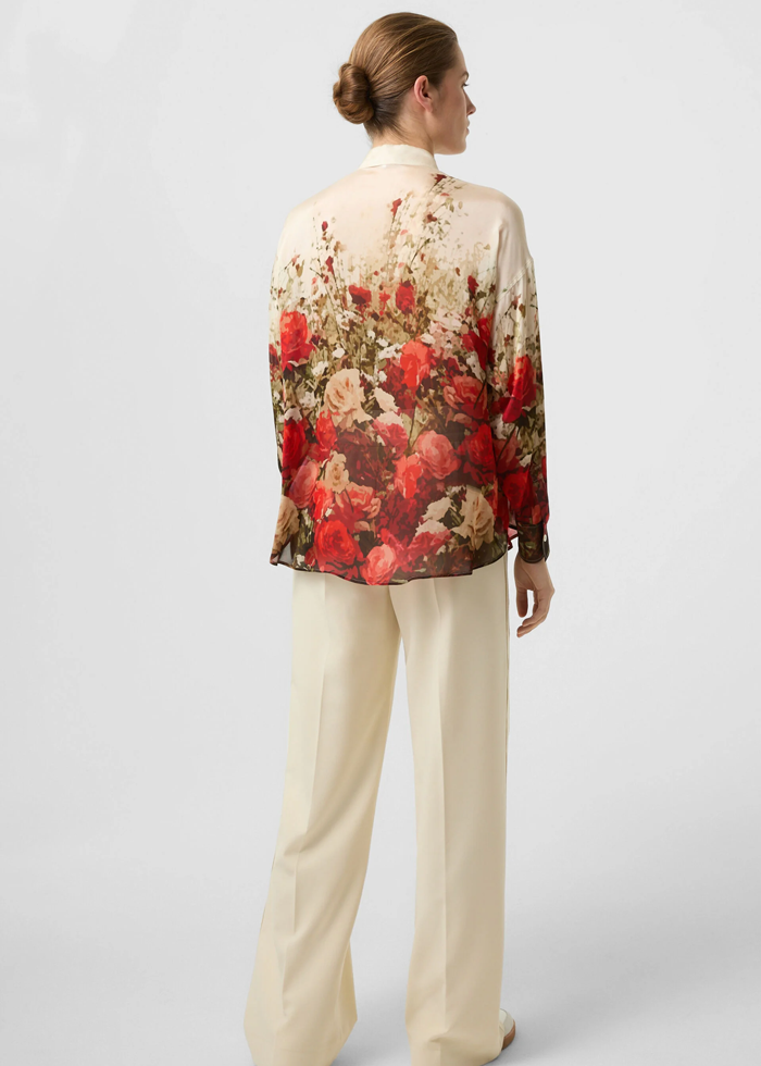 Viskozės ir šilko audinio laisvo silueto palaidinė ilgomis rankovėmis. Nuleista pečių juosta. Užsegami sagutėmis.