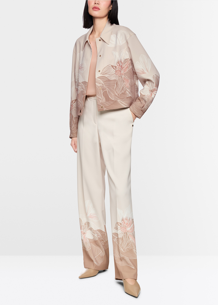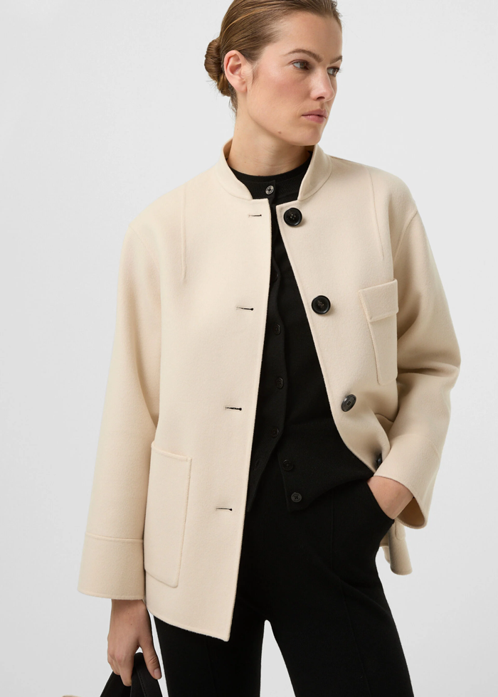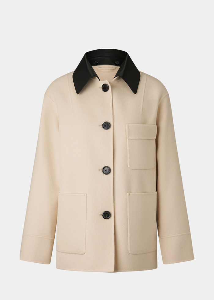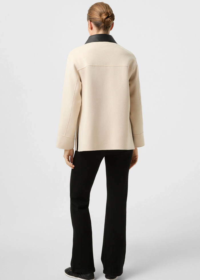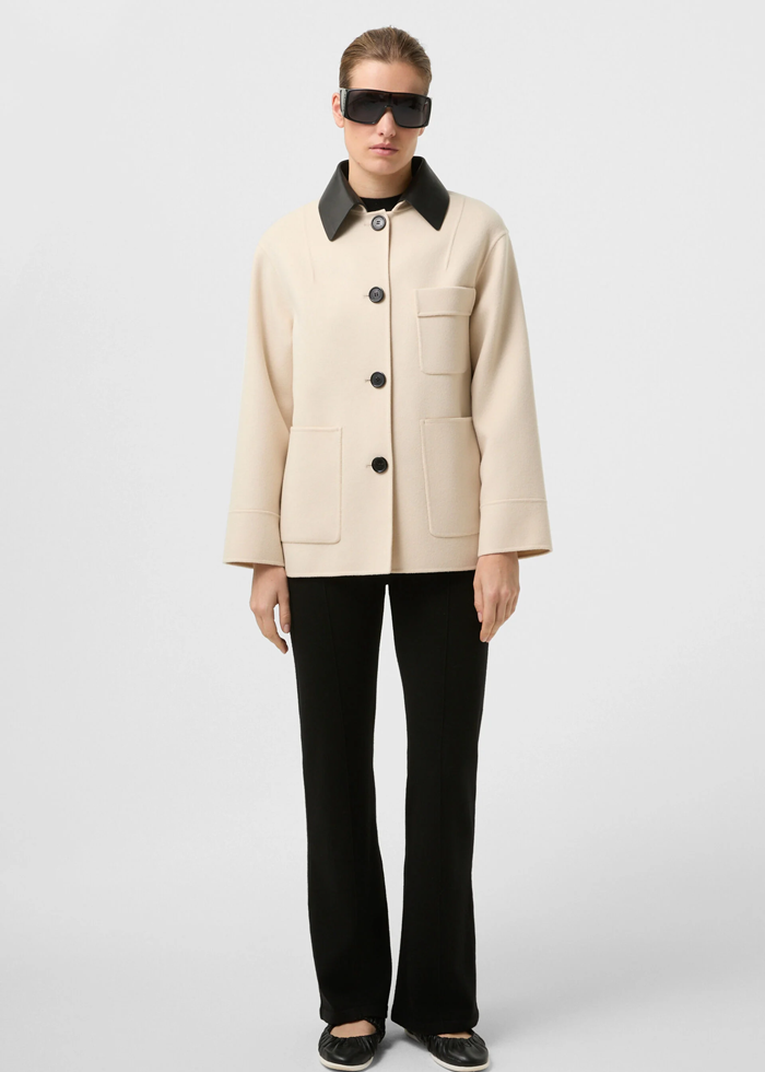 Šviesios spalvos vilnos audinio elegantiškas švarkas ilgomis rankovėmis. Nusegama odinė apykaklė. Užsegamas sagomis. Skeltai. Kišenės.