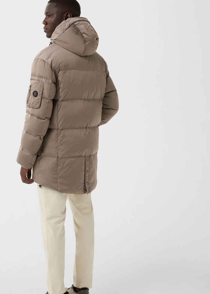 Smėlio spalvos dygsniuota prailginta šilta pūkinė striukė su gobtuvu. Užsegama dvigubu užtrauktuku ir spaudėmis. Užsegamos kišenės. Nepralaidi vėjui ir lietui.