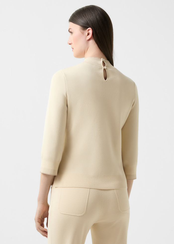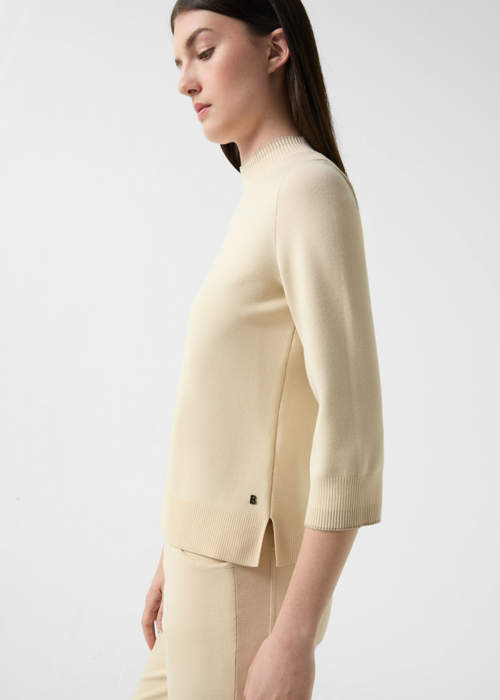 Kreminės spalvos elegantiškas megztinis ¾ rankovėmis. Aukšta užsegama sagutėmis apykaklė. Skeltukai šonuose.
