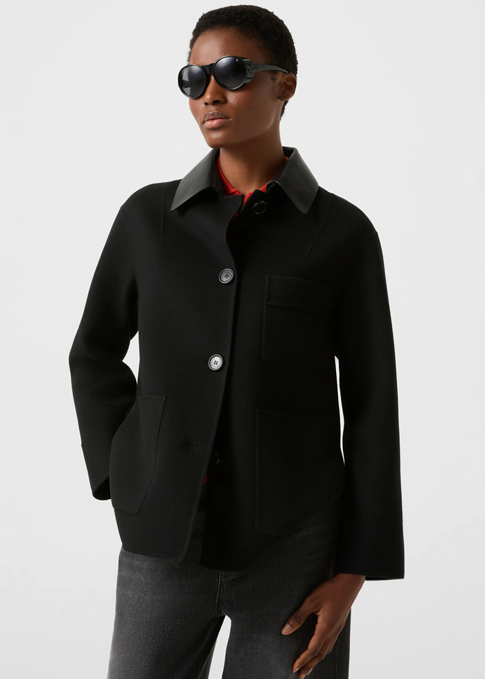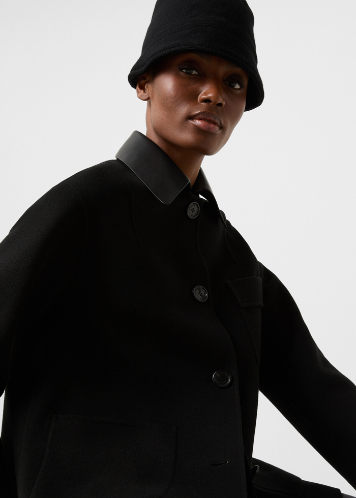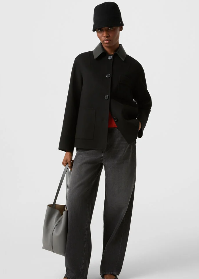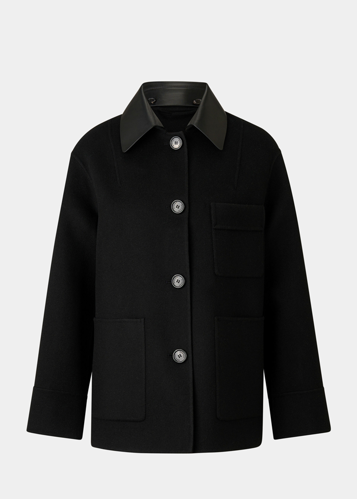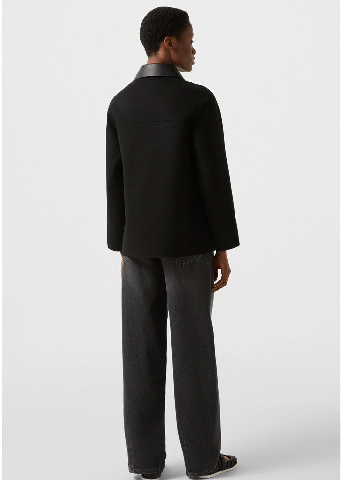 Juodos spalvos vilnos audinio elegantiškas švarkas ilgomis rankovėmis. Nusegama odinė apykaklė. Užsegamas sagomis. Skeltai. Kišenės.