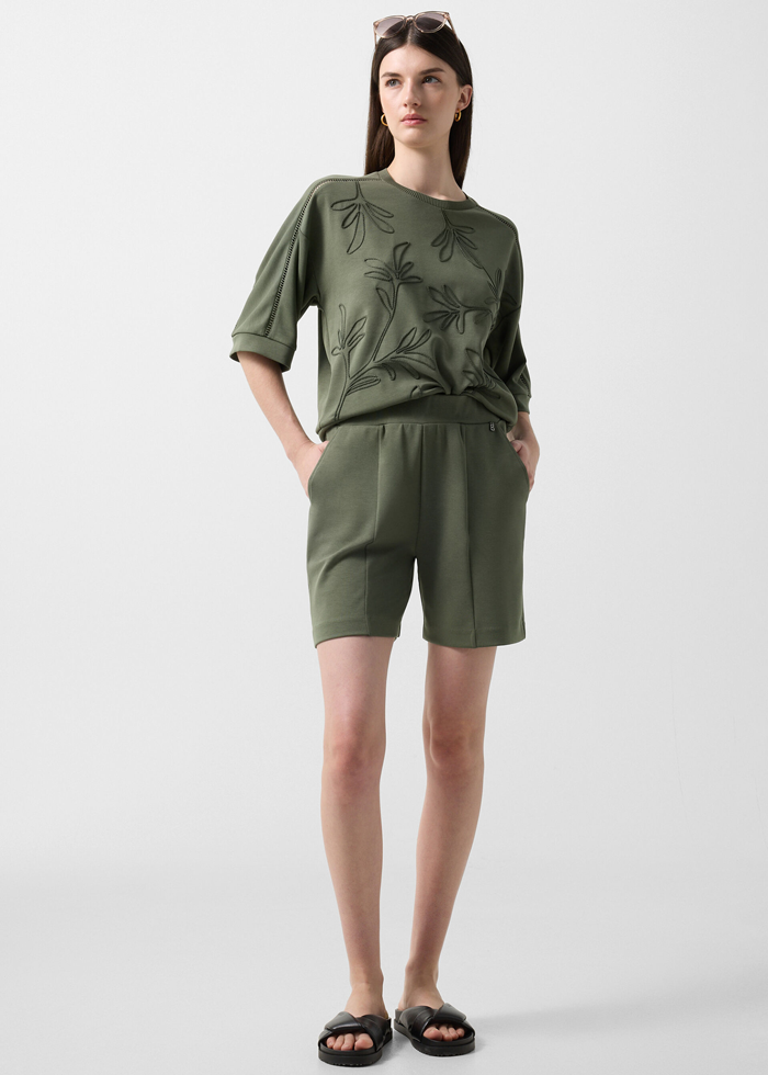 Romi džersio šortai – patogus pasirinkimas dėl elastingo juosmens ir modalo mišinio audinio. Modelį išskiria subtilus ažūrinis siuvinėjimas ir nedidelis logotipo pakabukas. Klasikinį akcentą suteikia gale esanti įsiūta kišenė.