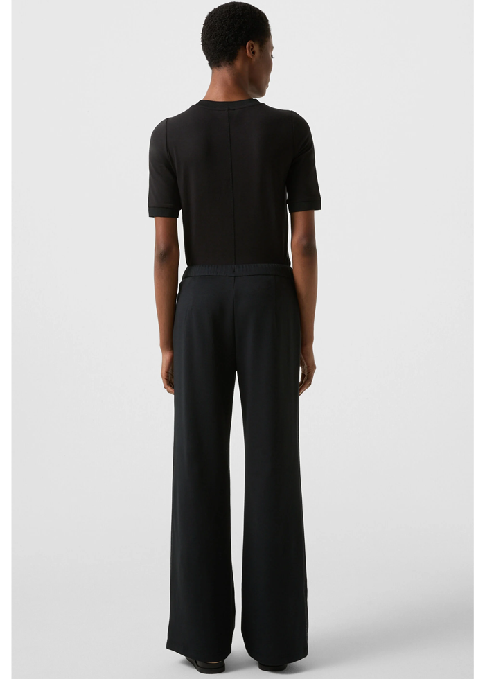 Juodos spalvos laisvalaikio kelnės tiesaus silueto. Vidutinis elastinis surišamas juosmuo. Kišenės.