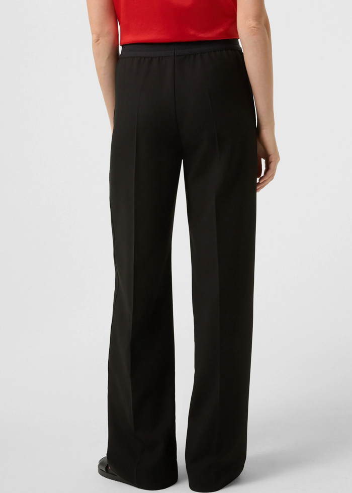Juodos spalvos plataus silueto kelnės. Elastinis juosmuo. Užsegamos kišenės.
