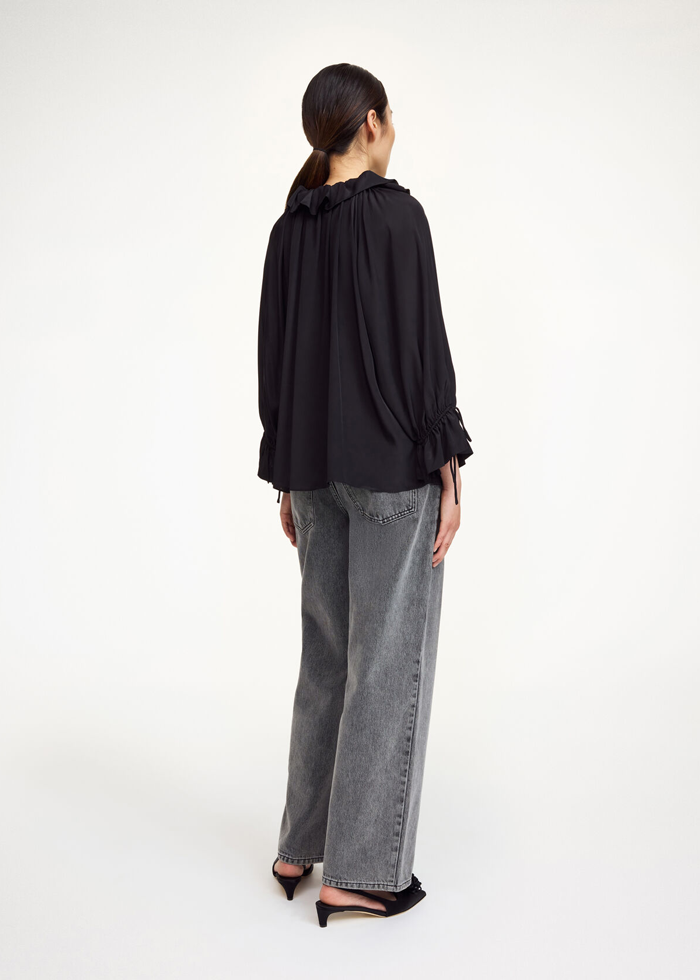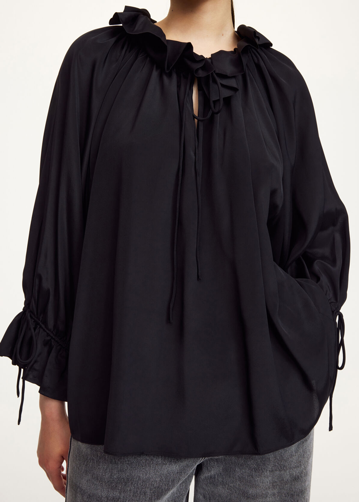 Juodos spalvos elegantiška laisvo silueto palaidinė ilgomis rankovėmis. Surišama kaklo iškirptė.