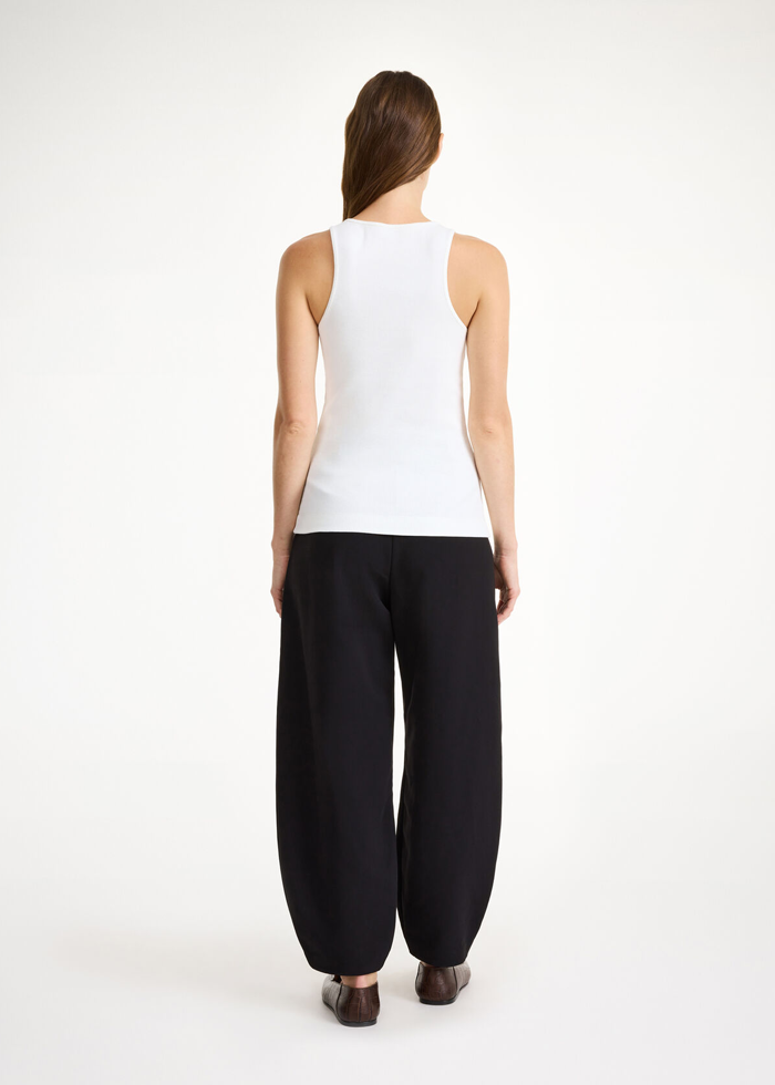 Baltos spalvos medvilniniai marškinėliai be rankovių. Apvali kaklo iškirptė.