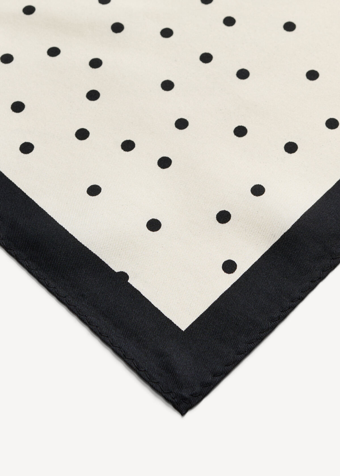 Suteikite savo įvaizdžiui grafiškumo su „Poula“ skarele. Iš prabangaus šilko pagamintas modelis, dekoruotas žaismingais taškeliais, yra itin universalus – riškite ją ant kaklo, riešo ar prie rankinės rankenos.