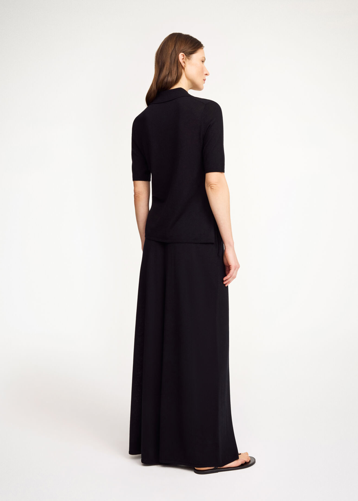Juodos spalvos elegantiškas megztinis trumpomis rankovėmis. Polo apykaklė. Užsegamas sagomis. Minimalus ikoniškas logotipas.