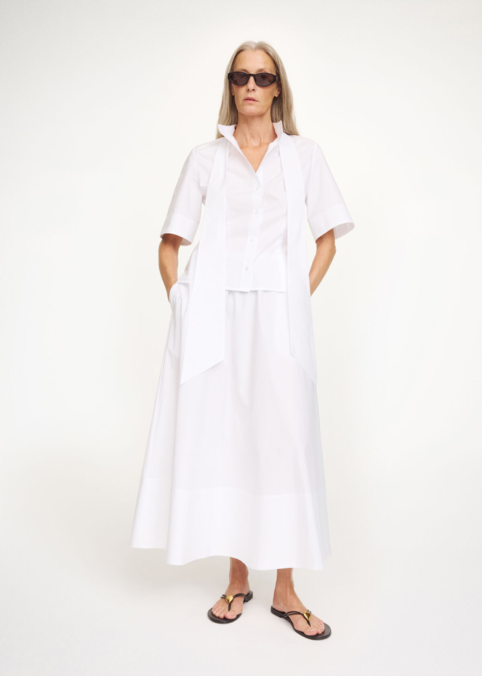 Baltos spalvos elegantiški marškiniai trumpomis rankovėmis. Laisvas siluetas. Surišama apykaklė. Užsegami sagutėmis.