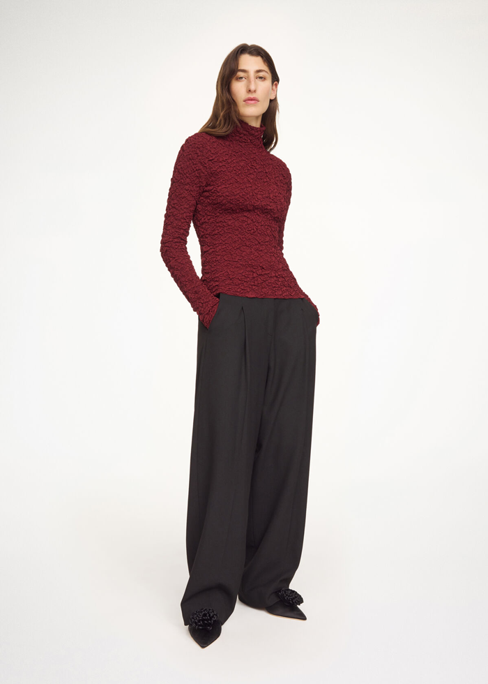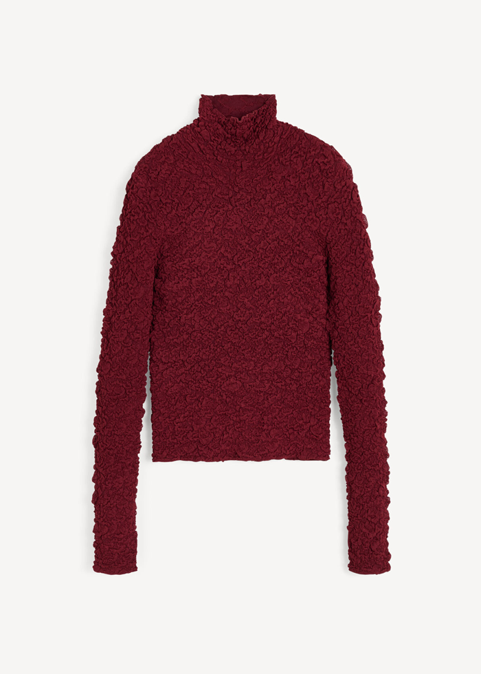 Plisuota rudos spalvos palaidinė plačiomis rankovėmis.