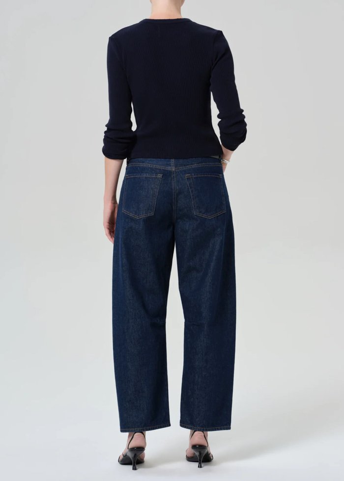 „Miro“ Petite džinsai – trumpinta, moderni „barrel“ silueto interpretacija su aukštu liemeniu ir laisvai siaurėjančiomis klešnėmis. Pagaminti iš tvirtos regeneratyvios medvilnės, su švariu tamsaus džinso atspalviu, suteikiančiu elegantišką įvaizdį.