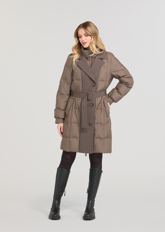 Šokoladinės spalvos pūkinė ilga striukė su gobtuvu. Užsegama spaudėmis. Kišenės. Sujuosiama dirželiu.