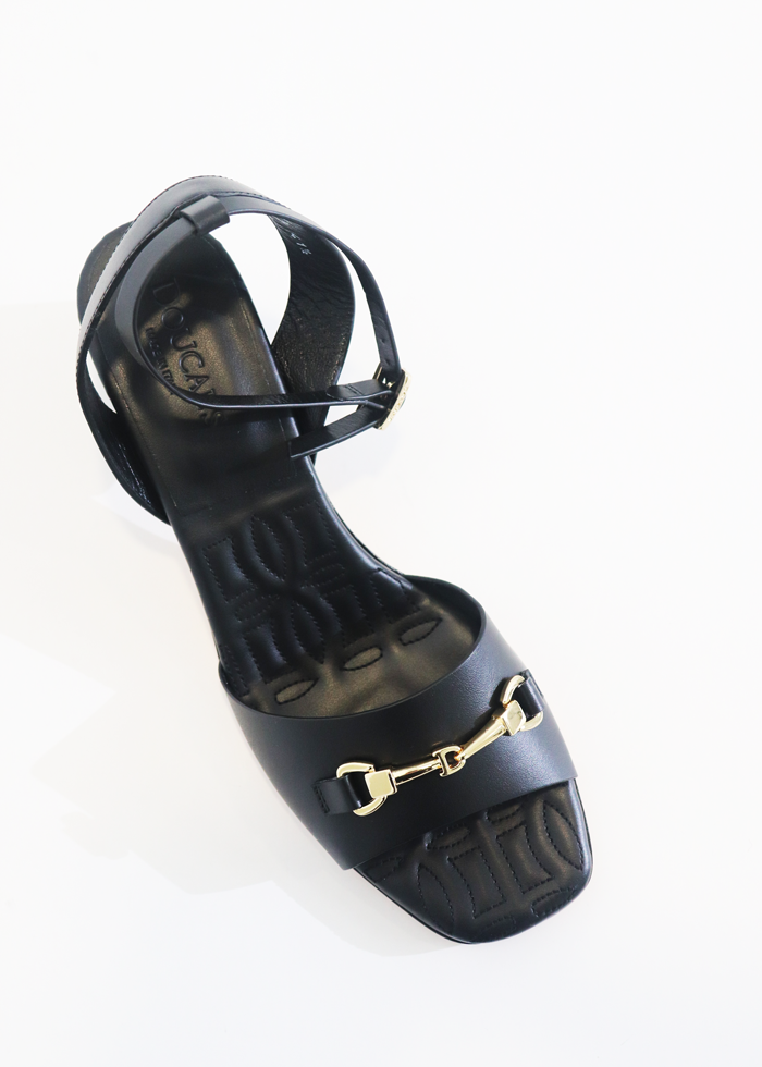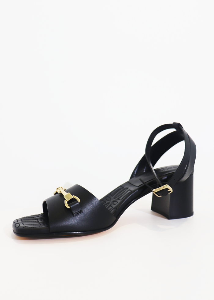 Juodos spalvos elegantiškos atvirakulnės basutės ant kulno. Užsegamos reguliuojama sagtele. Aukso spalvos detalė.
