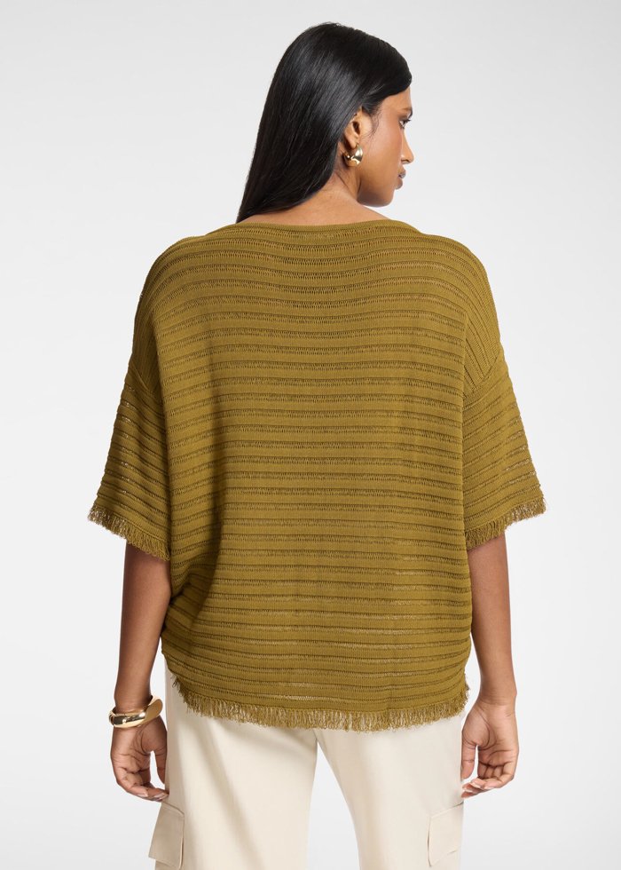 Perforuoto mezgimo džemperis iš viskozės mišinio. Laisvo, šiek tiek oversize silueto modelis su trijų ketvirčių kimono tipo rankovėmis ir apvalia plačia iškirpte. Kraštus puošia kutai, suteikiantys išskirtinumo ir modernumo.