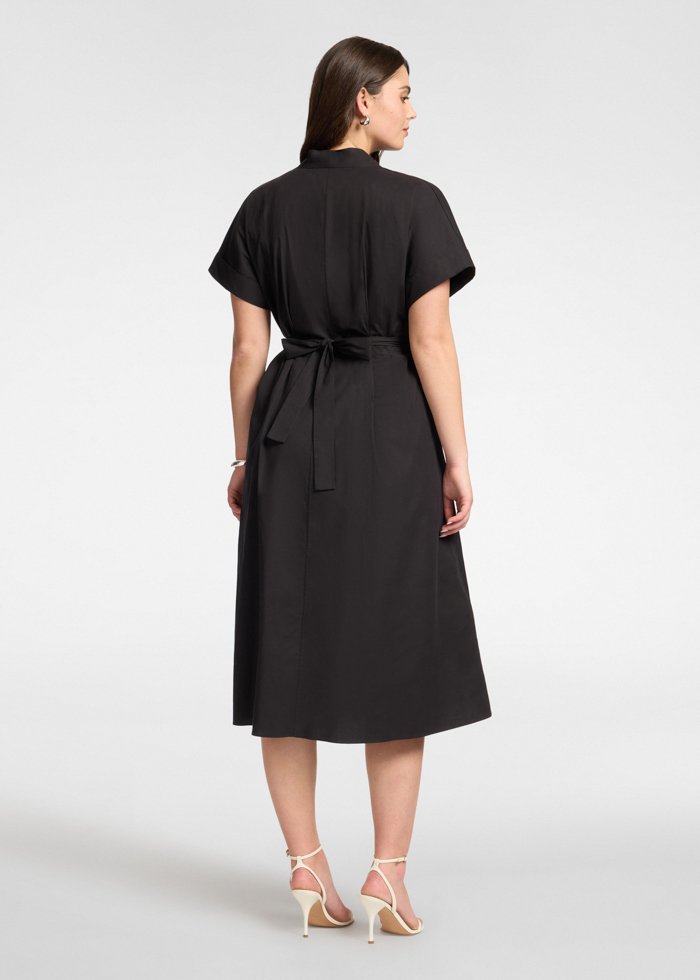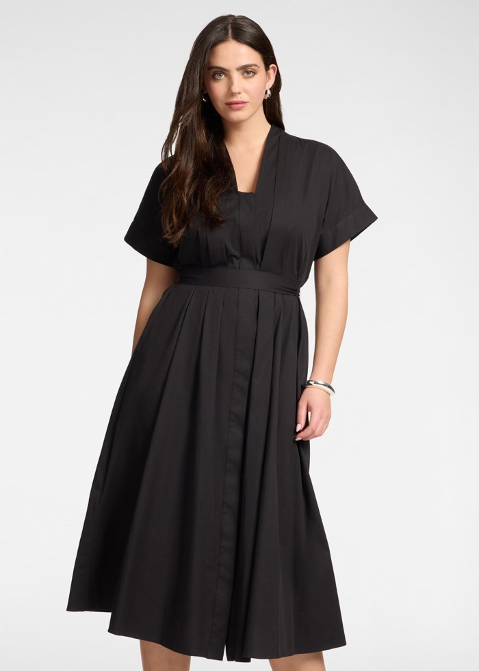 Midi ilgio suknelė iš medvilnės mišinio poplino, platėjančio silueto. Modelis su V formos iškirpte, trumpomis rankovėmis, priekinėmis klostėmis ir to paties audinio diržu, pabrėžiančiu liemenį. Lengvai pritaikoma tiek dienai, tiek elegantiškesniems deriniams.