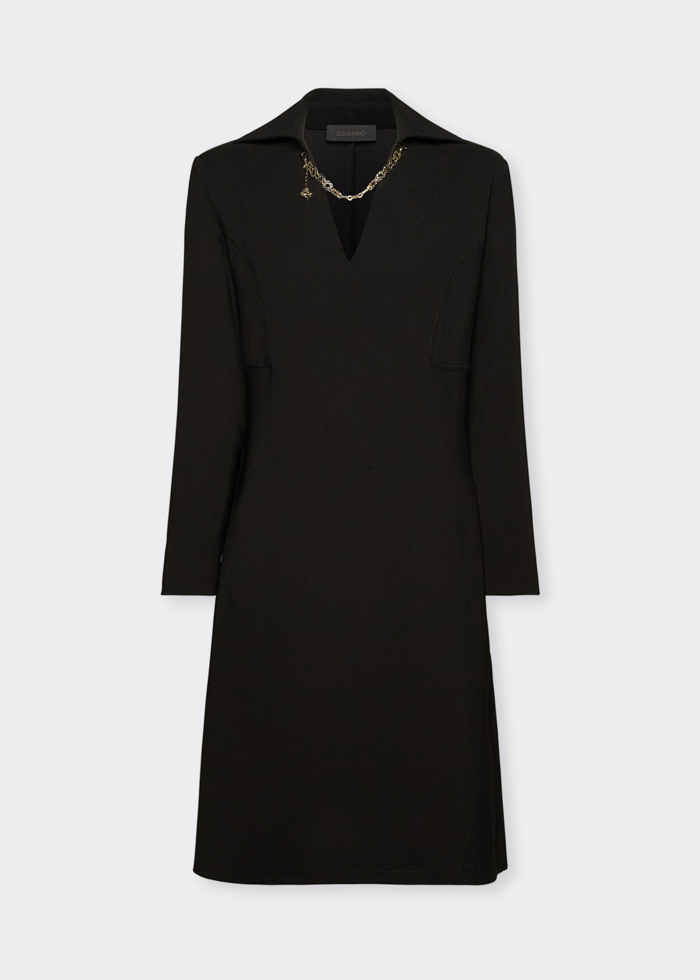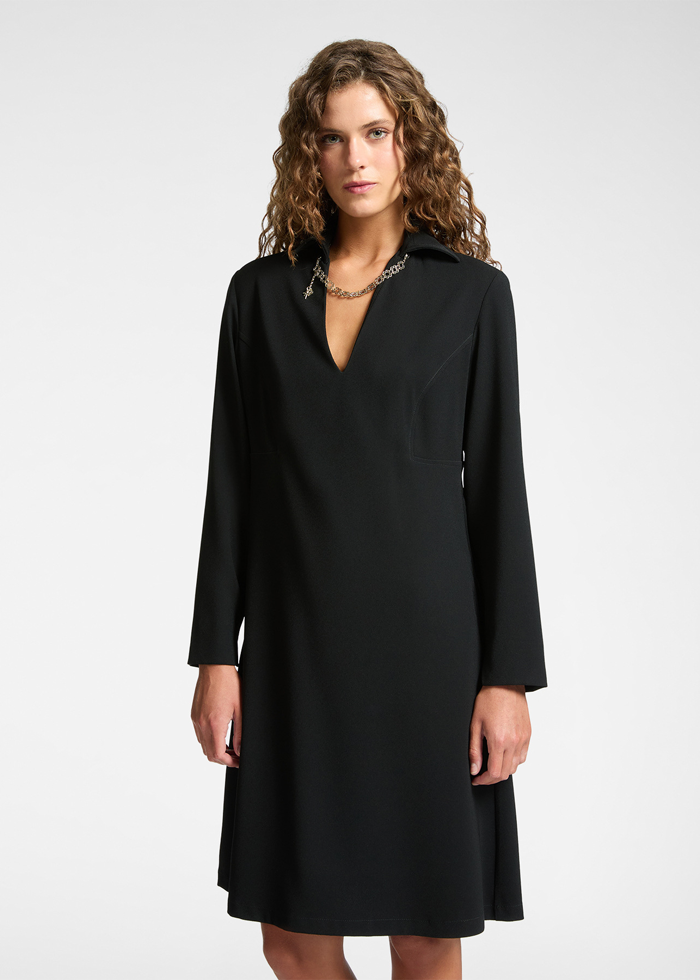 Juodos spalvos elegantiška suknelė A formos silueto. Ilgos rankovės. V formos kaklo iškirptė dekoruota grandinėle.