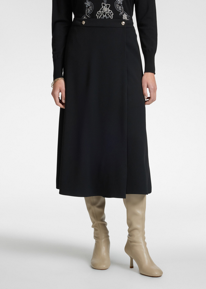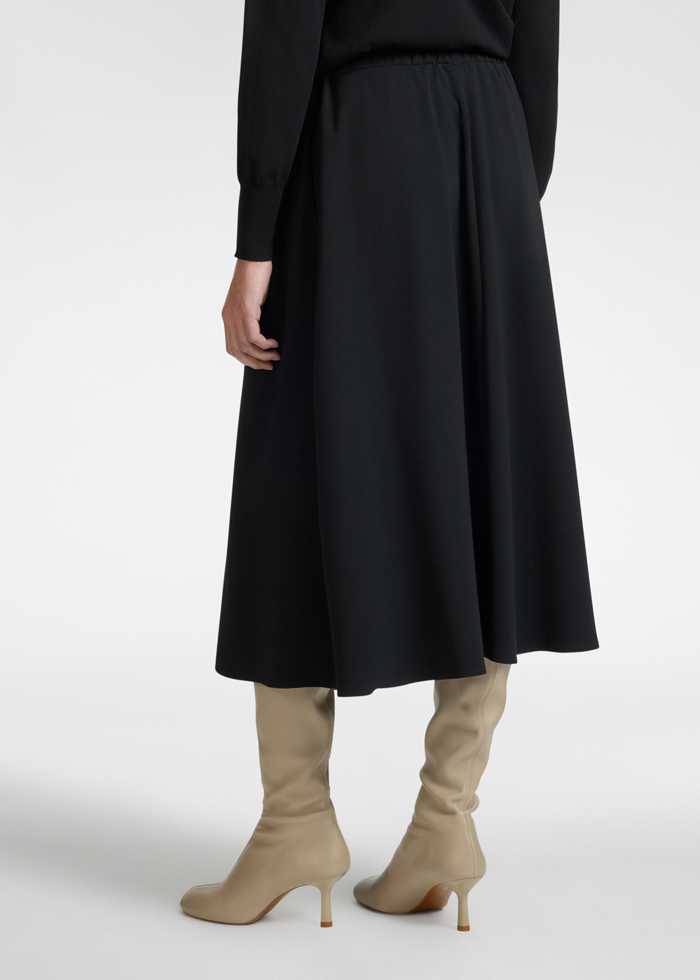 Juodos spalvos laisvo silueto midi ilgio sijonas. Vidutinis elastinis juosmuo. Sujuosiamas su saga.