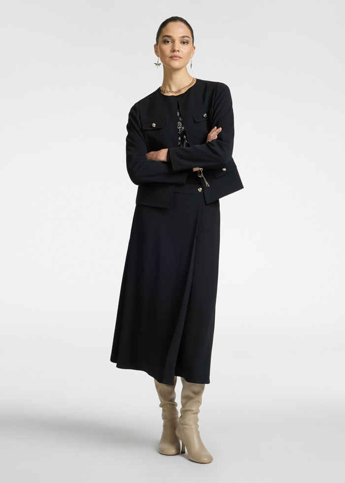 Tamsiai pilkos spalvos elegantiškas midi ilgio sijonas. Didelė raukinio detalė. Užsegamas užtrauktuku.