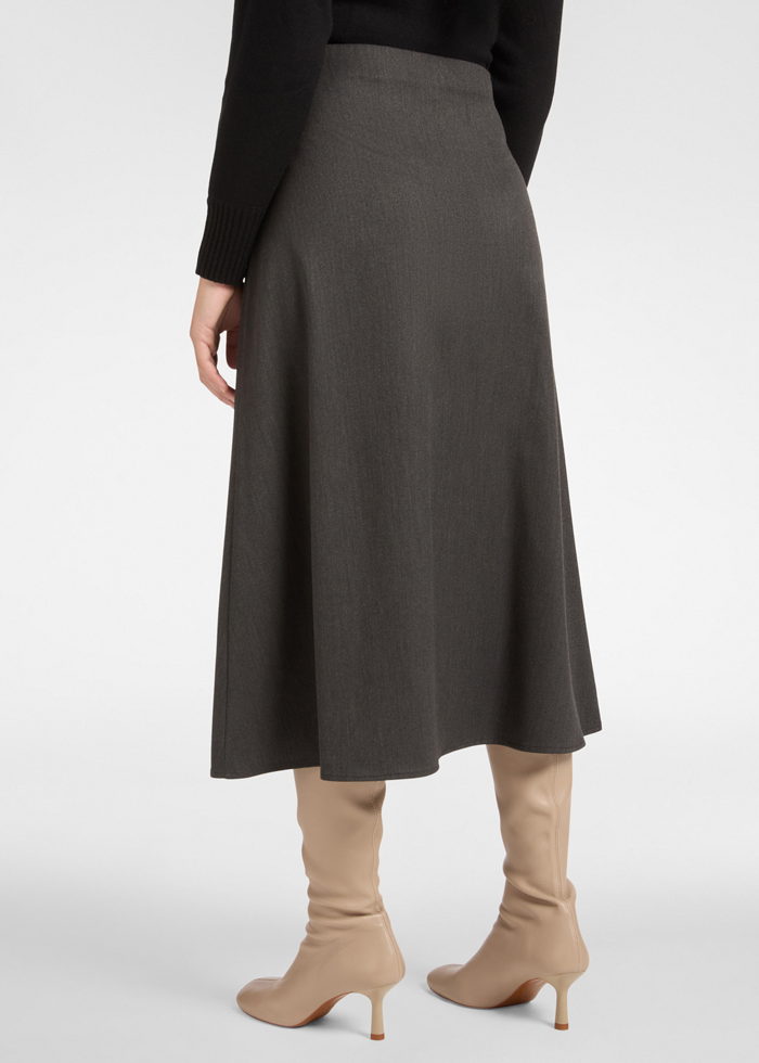 Tamsiai pilkos spalvos elegantiškas midi ilgio sijonas. Didelė raukinio detalė. Užsegamas užtrauktuku.