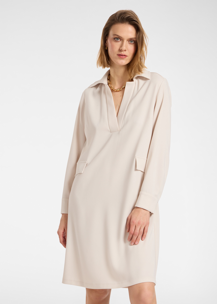 Šviesios spalvos elegantiška suknelė A formos silueto. Ilgos rankovės. V formos kaklo iškirptė.