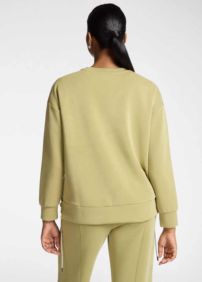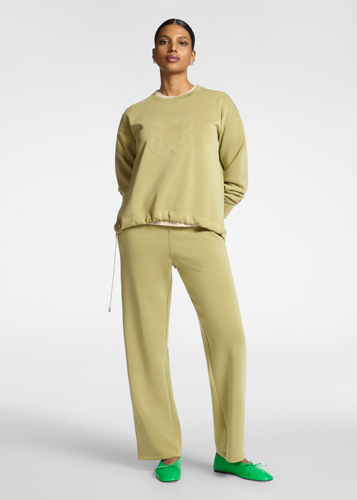 Švelniai žalios spalvos laisvalaikio džemperis ilgomis rankovėmis. Apvali kaklo iškirptė. Sutraukiamas prabangiais raišteliais.