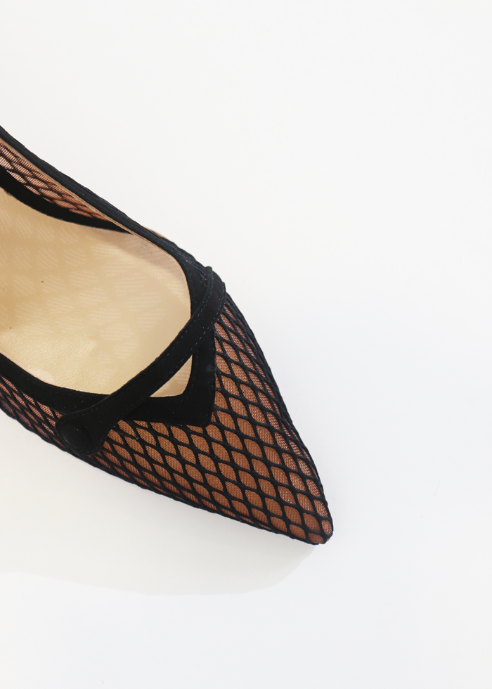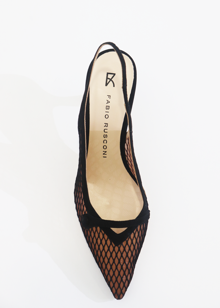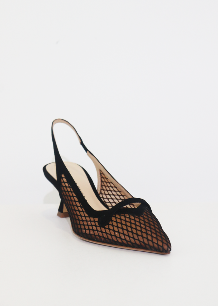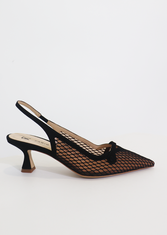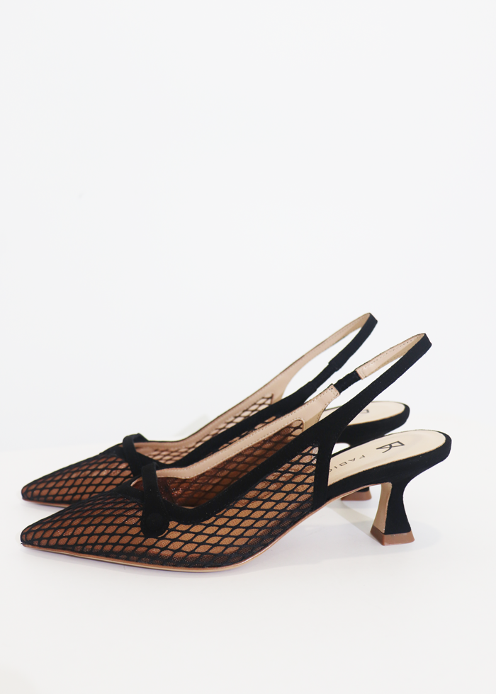 Juodos spalvos elegantiški bateliai ant kulno. Atvirakulniai. Smailėjanti noselė. Dekoruoti tinkleliu.