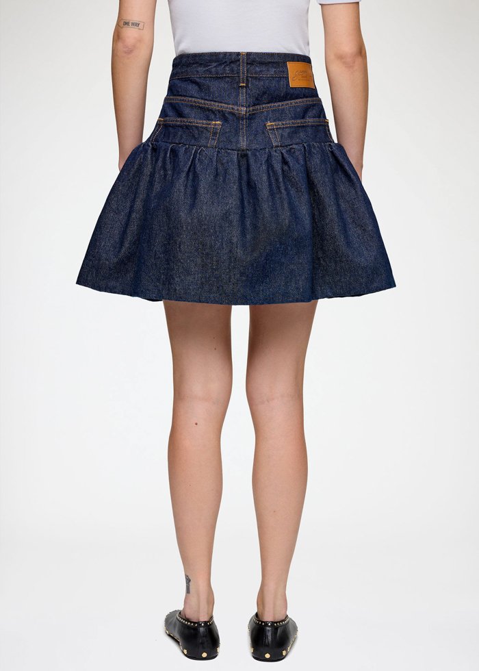 Šis sijonas pasižymi „bubble“ tipo siluetu, kuris suteikia išraiškingą ir modernų įvaizdį. Modelis užsegamas saga ir užtrauktuku, turi diržo kilpas bei penkių kišenių dizainą, užtikrinantį funkcionalumą.