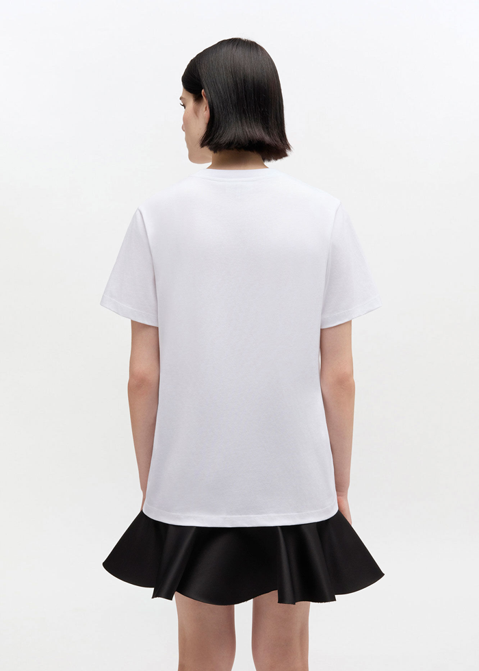 Baltos spalvos medvilniniai marškinėliai trumpomis rankovėmis. Apvali kaklo iškirptė. Aplikacija.