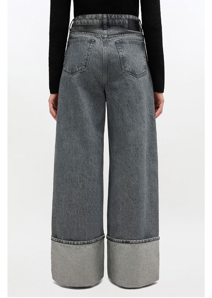 Pilkos spalvos plataus silueto džinsai. Vidutinis juosmuo. Užsegami dviem skirtingais sagų būdais. Penkių kišenių modelis. Kilpos diržui.