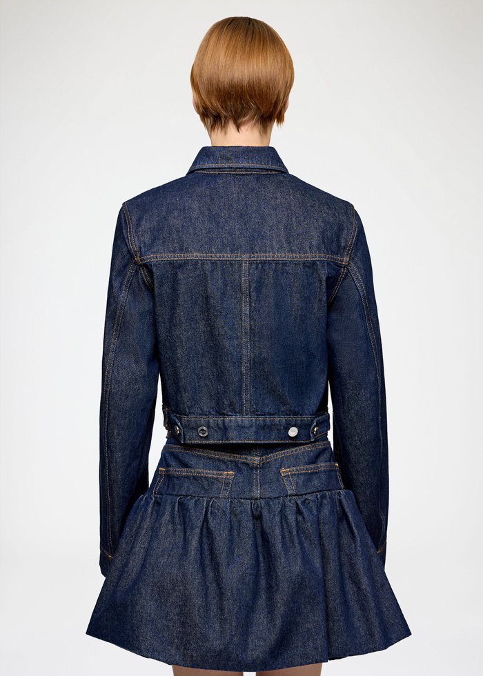 Džinsinis švarkelis su klasikine apykakle ir sagų užsegimu per visą ilgį. Modelis ilgomis rankovėmis, priekyje – dvi kišenės su atvartais, suteikiančios funkcionalumo ir stiliaus.