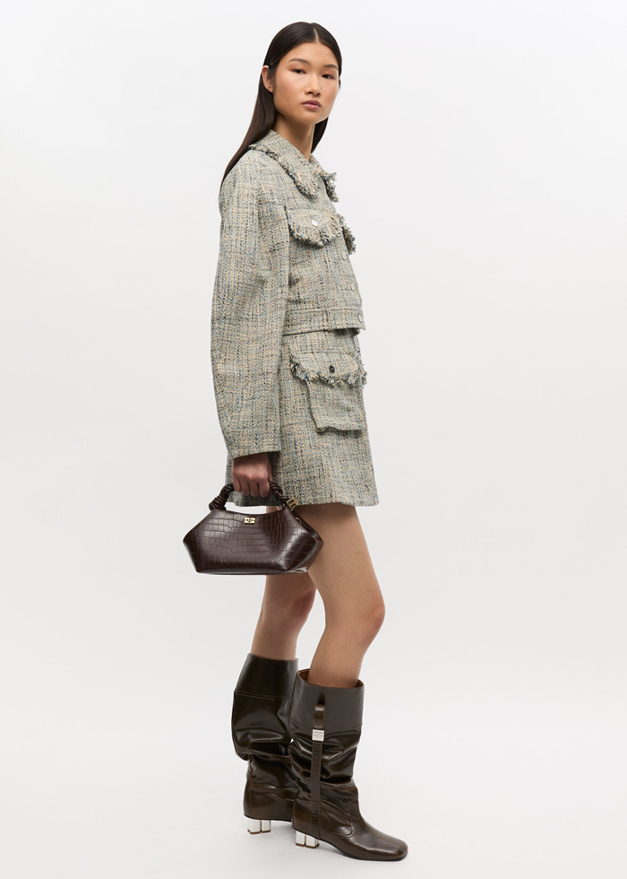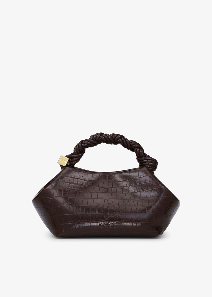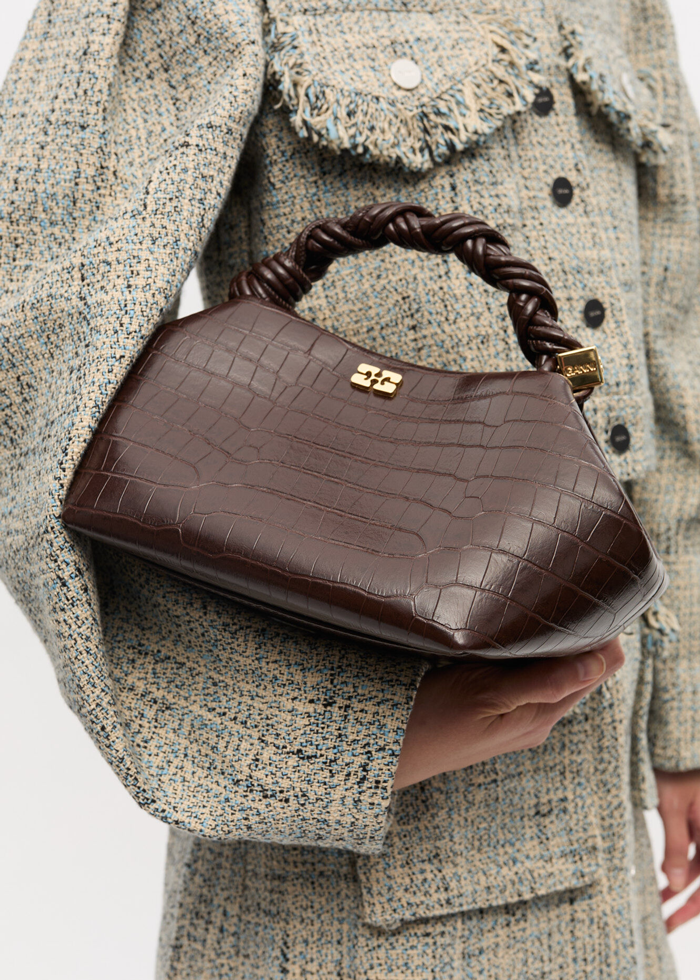 Šokoladinės Croco spalvos ikoniška GANNI Small BOU Bag rankinė. Pinta rankena. Ilgas reguliuojamas perpetinis diržas. Užsegama magnetine spaude. Logotipas. Aukso spalvos minimali detalė.