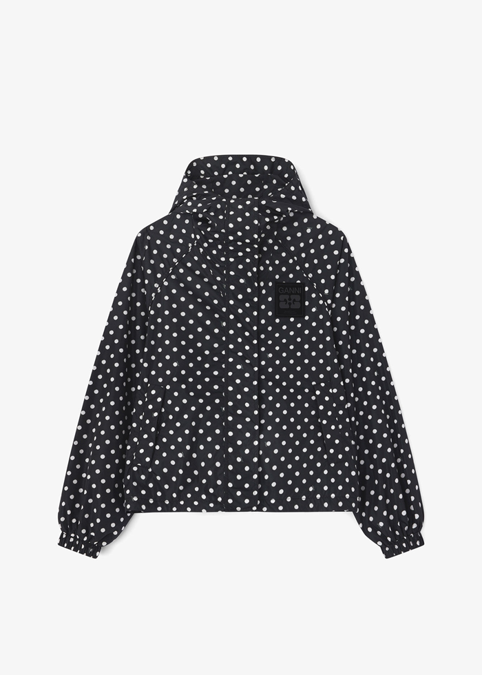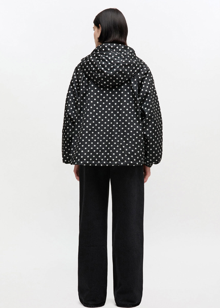 Polka dots rašto plona striukė su gaubtuvu. Užsegama užtrauktuku. Aukšta apykaklė. Sutraukiama raišteliu. Užsegamos kišenės.