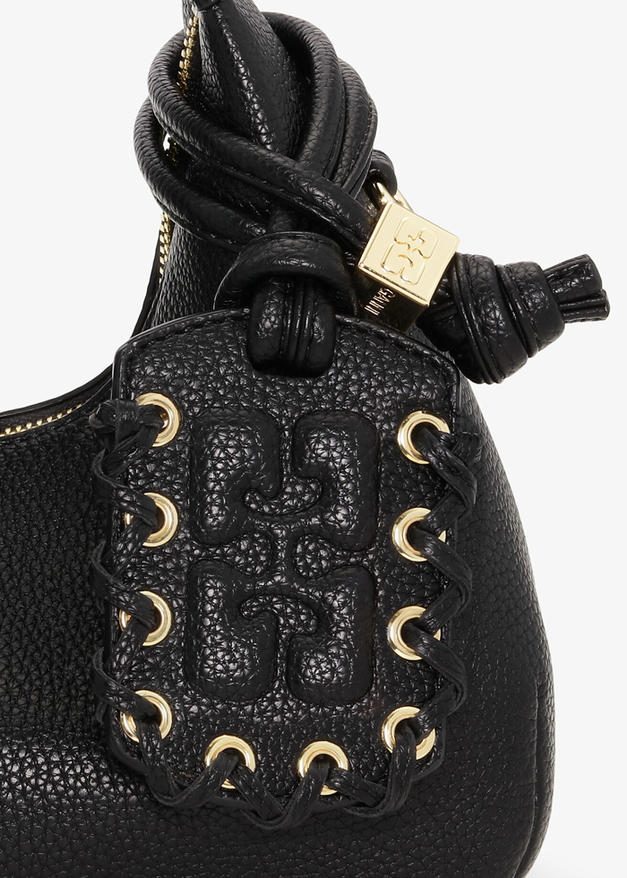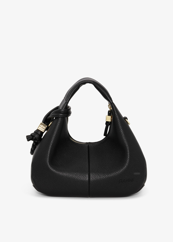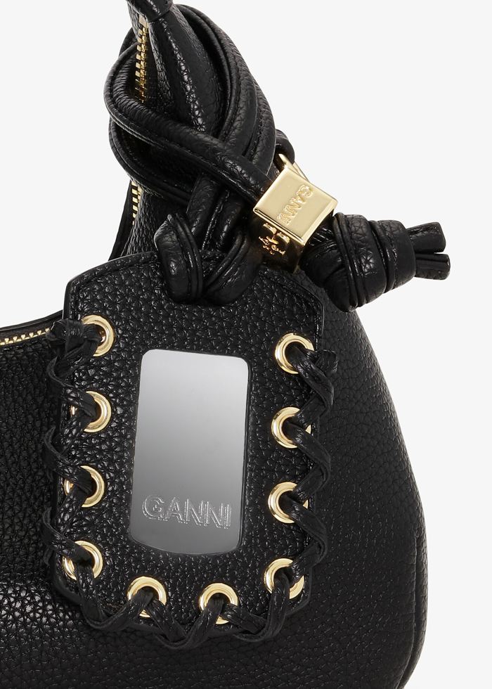 Juodos spalvos stilinga GANNI ,,Black Mini Hobo Bag” rankinė. Aukso spalvos furnitūra. Užsegama užtrauktuku. Pridėtas veidrodėlis.