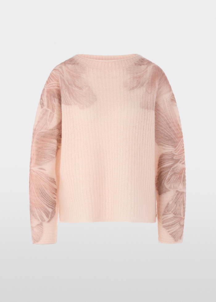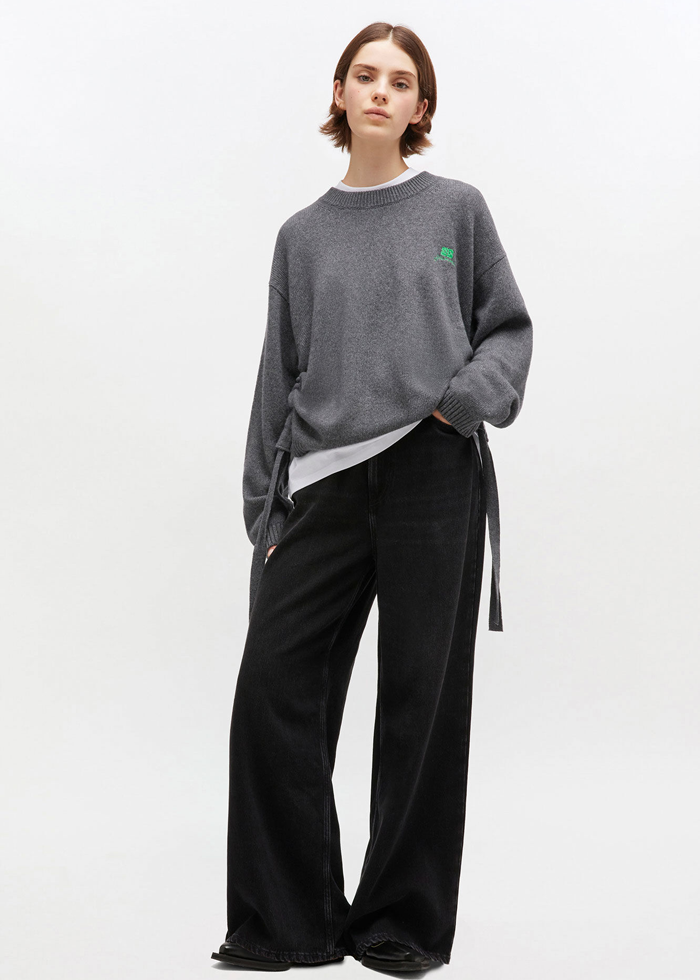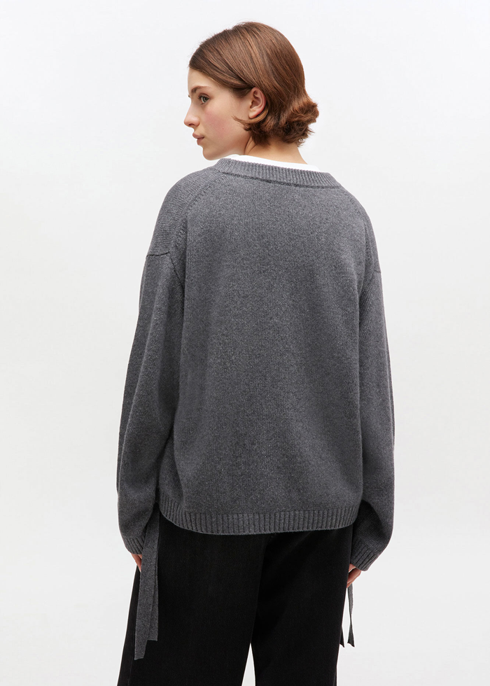 Pilkos spalvos laisvo silueto džemperis ilgomis rankovėmis. Apvali kaklo iškirptė. Sutraukiami šonai.