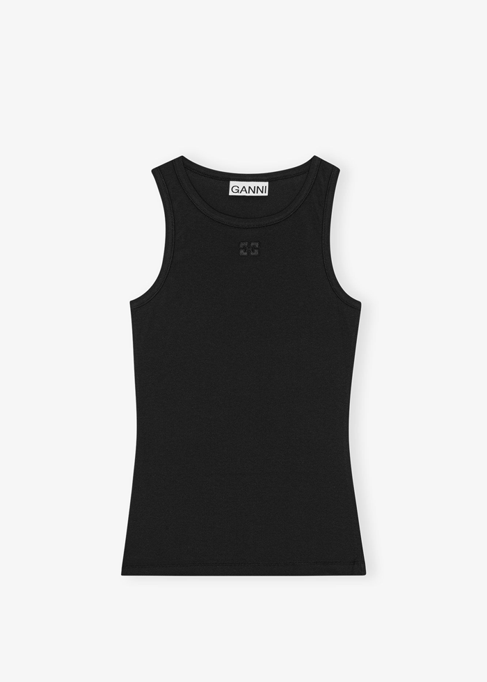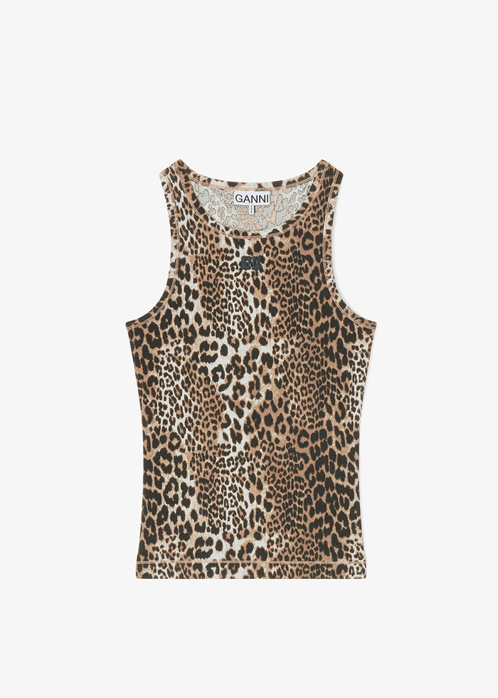 Leopardo rašto medvilniniai marškinėliai be rankovių. Ikoniškas GANNI logotipas.