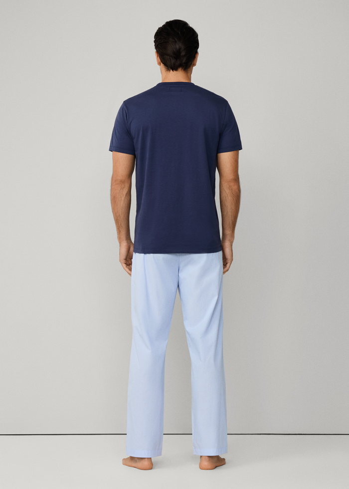 Tamsiai mėlynos spalvos medvilniniai marškinėliai trumpomis rankovėmis. Apvali kaklo iškirptė. Ikoniškas minimalus išsiuvinėtas logotipas.
